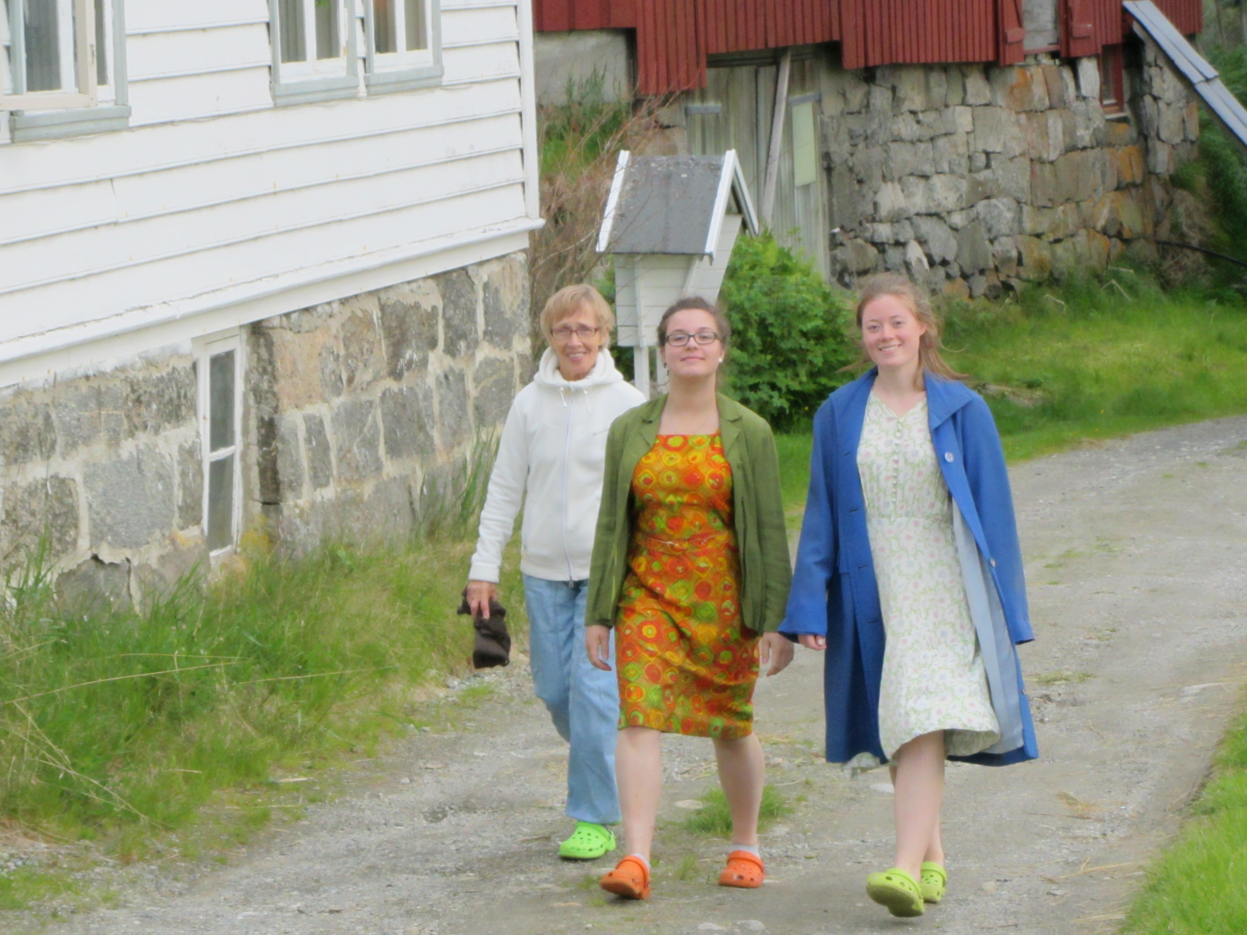 Tuva and Christina dressed up in old dresses, found in the Theodorhouse. Really gorgeous among plastic-shoes.... but my mother Jorunn is having fun!